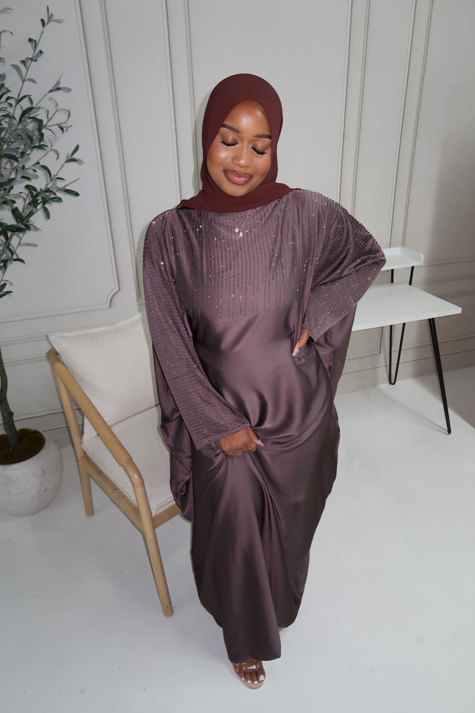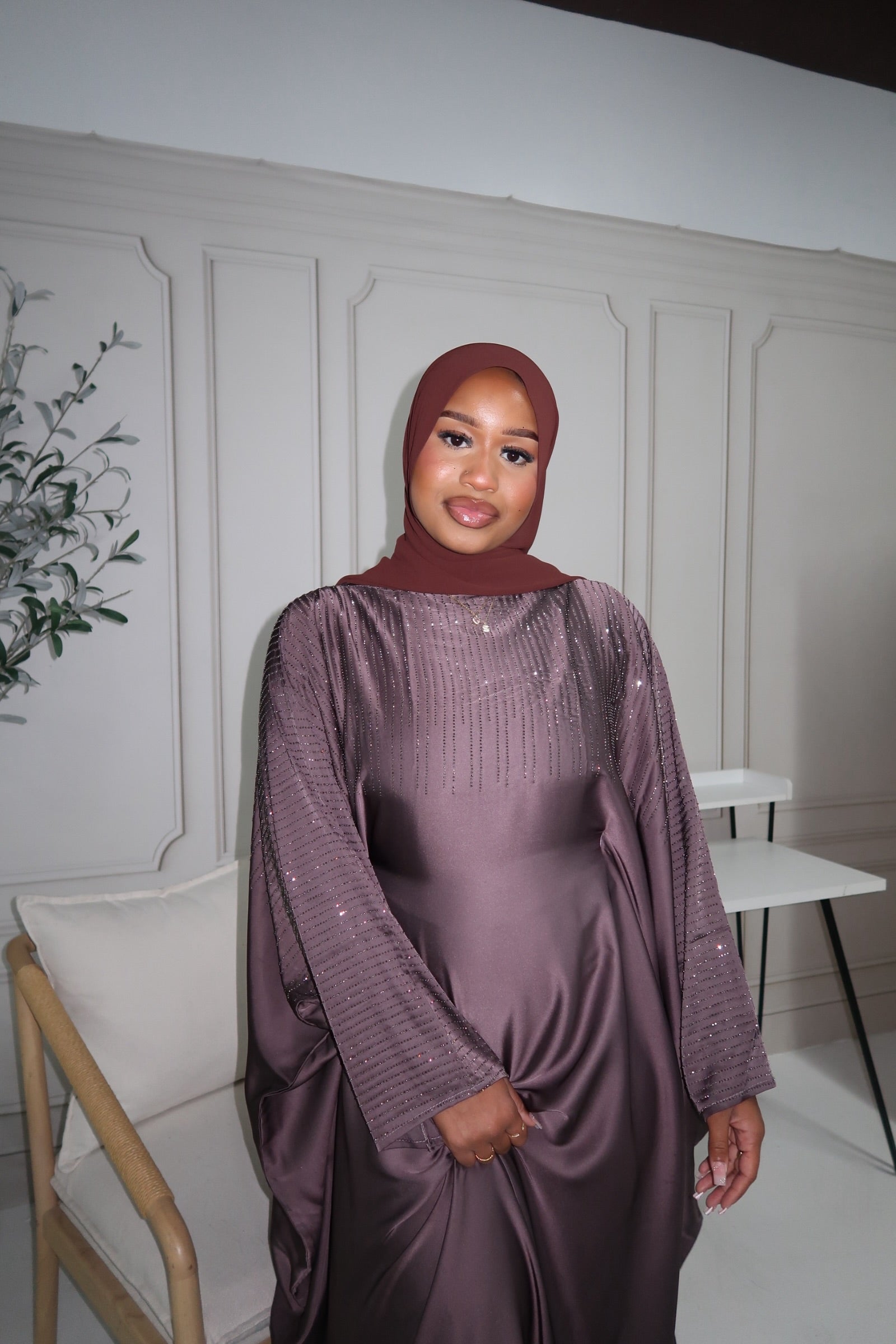 Introducing Faatima Kaftan in Fig Rose. A lightweight 2-piece set featuring a flowy satin kaftan and matching chiffon hijab. Elegant, airy, and perfect for any special occasion.